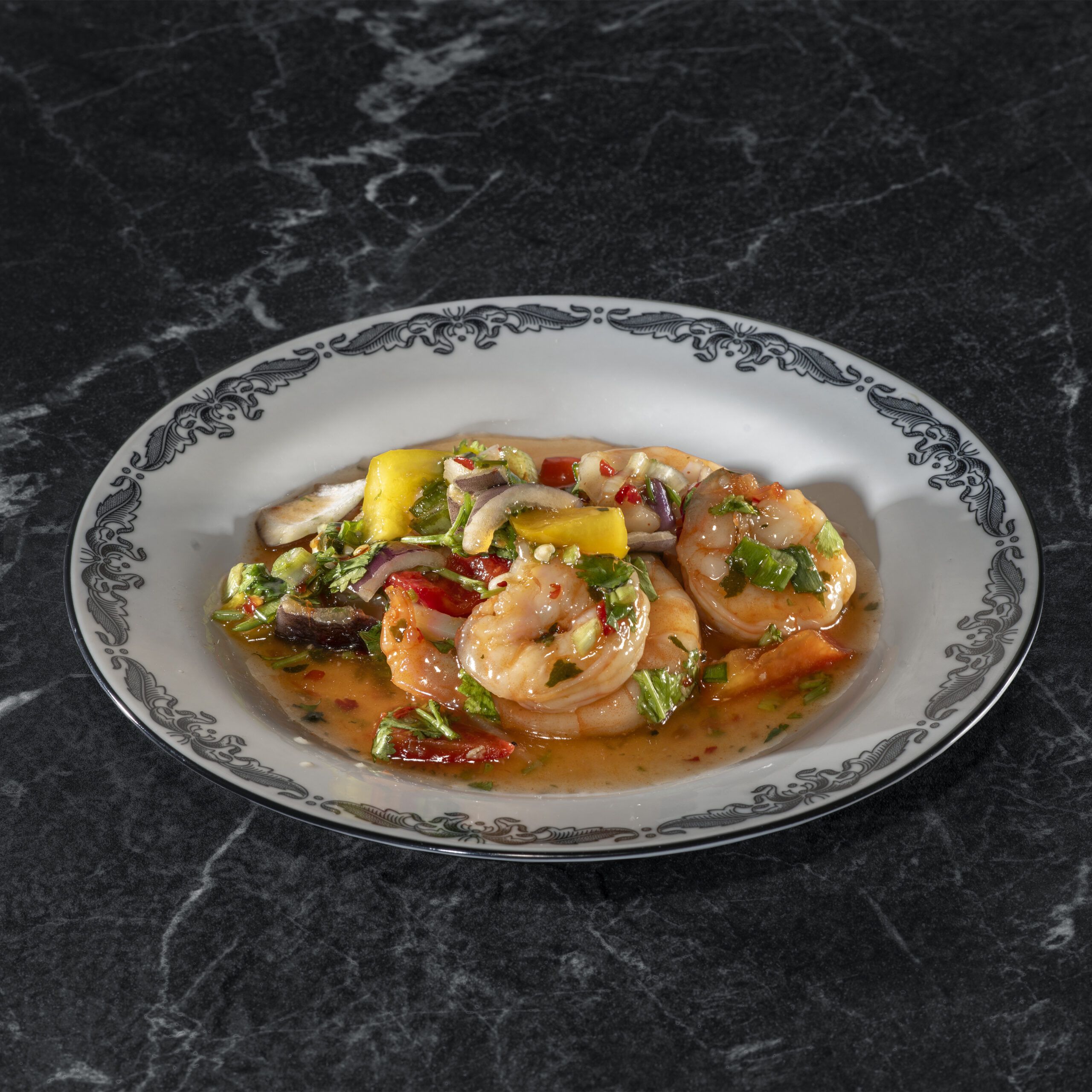 Ceviche med scampi, koriander, paprika, salladslök, röd lök, chili och lime.