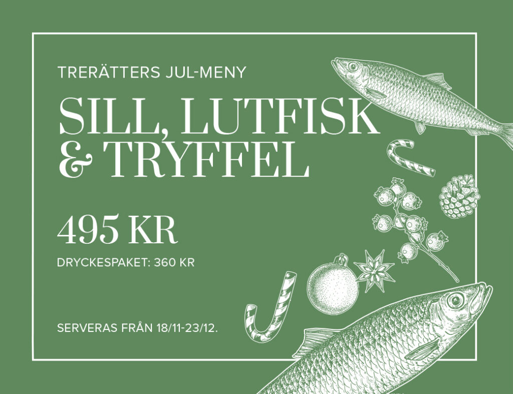 Julen flyttar in på Söder från och med den 2 december. Vi serverar både lunch och middag med klassiska rätter som sill och lutfisk tillsammans med noga utvalda drycker och efterrätter som hör julen till.